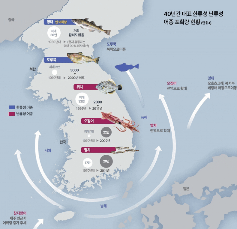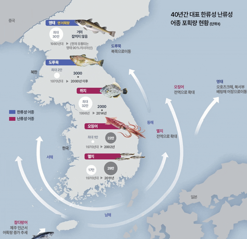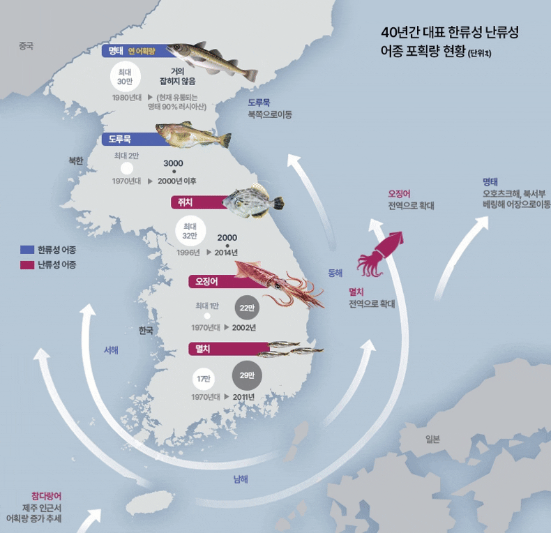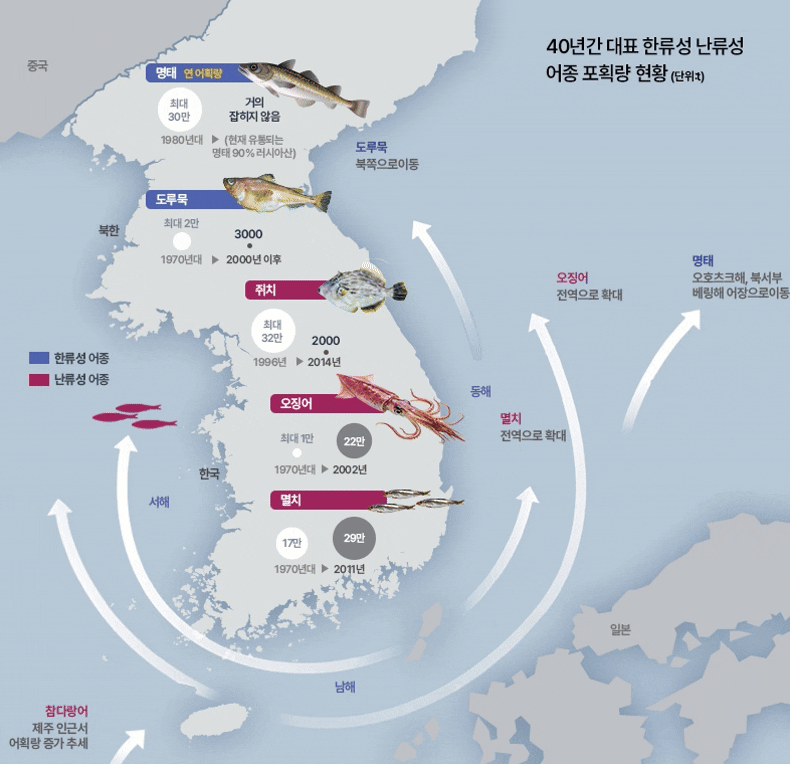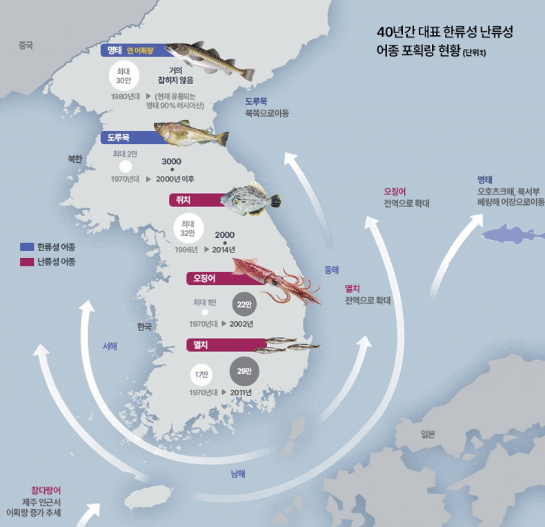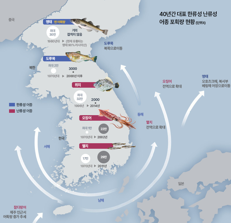 한류성 어종인 명태는 연간 30만톤이나 잡혔지만, 최근엔 볼 수 없다. 대표적 난류성 어종인 오징어는 1만톤에서 22만톤으로 변경됐고, 멸치 역시 늘어나고 있다.